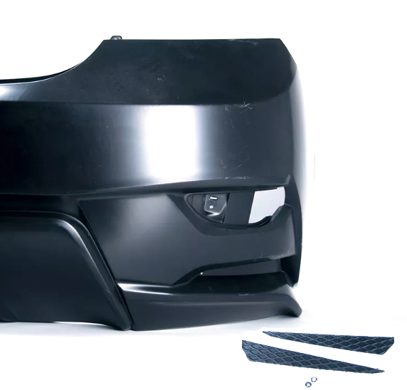 - Дизайн: Фирменные сетки переднего бампера выполнены из пластика в форме сот, что придает автомобилю агрессивный и стильный вид.